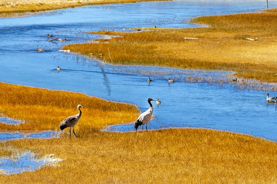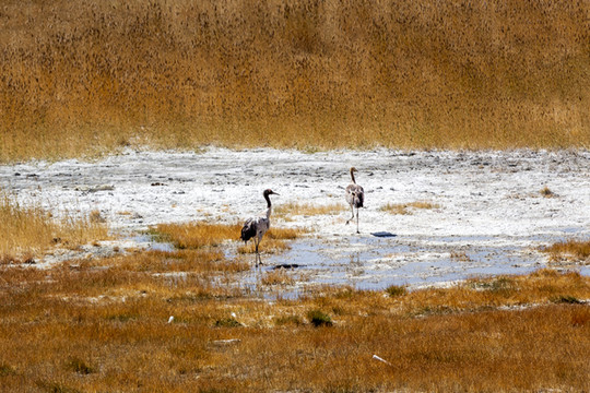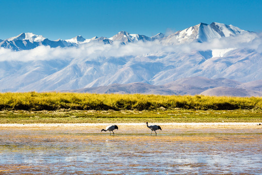 雪山下的湿地里,两只黑颈鹤悠闲的漫步,这个和谐优美的画面才是大自然应该有的样子
