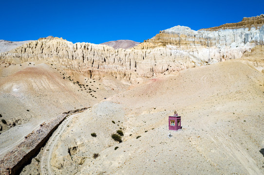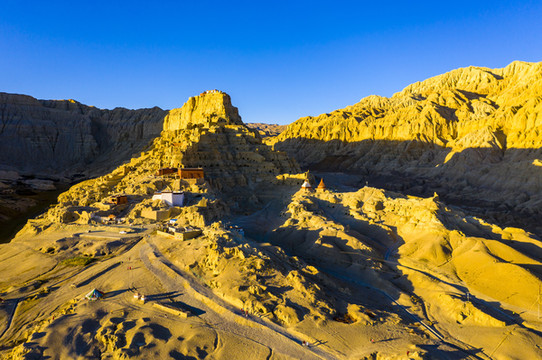 大鹏鸟是象雄王国的图腾。遗址两边山崖银白色的土林,仿佛大鹏鸟的翅膀,中间深色土林伸出山体,如同大鹏鸟的身体与头。山体上遍布着洞穴,有些还存有古老的经书和壁画。