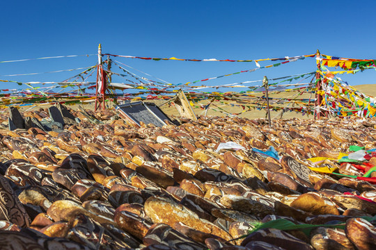 湖边的基乌寺有大量的刻着真言的尼玛石,尼玛堆是藏民的理想、信仰和追求,将真言刻在石头上,更是他们对信仰的崇高敬意