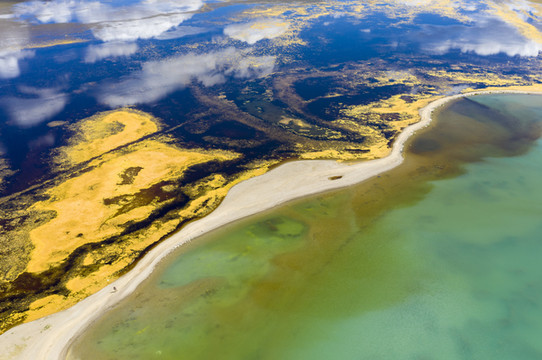 一个湖被一道沙堤隔成了两片,湖水的颜色也分成两种