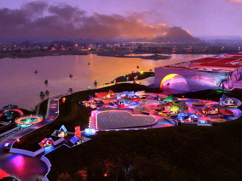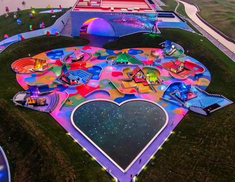 戏剧幻城坐落于滨水的半岛内,建筑群落的构成主体是方形主剧场和心形前广场,方形代表男士,心形代表女士,也暗示了男女情爱是戏剧的最重要内容。