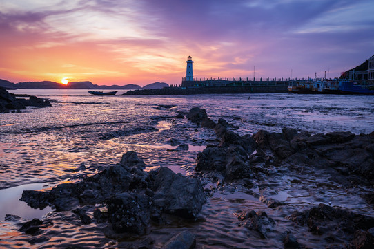 灯塔上,红日白云,灯塔下,海浪沙滩船只,随手就是一张绝妙的大片。